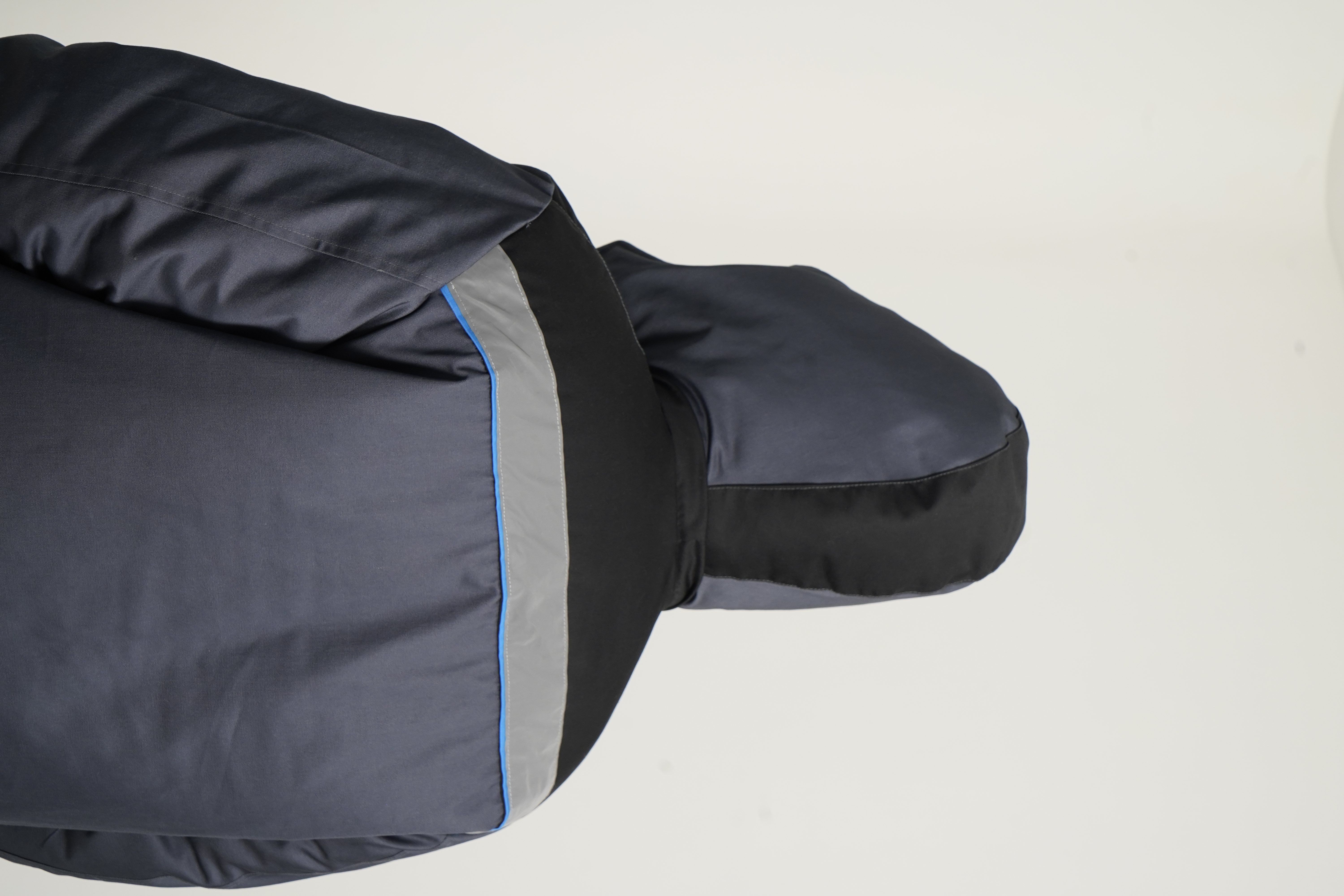 Colors: dark gray + light gray, trim with cornflower blue piping