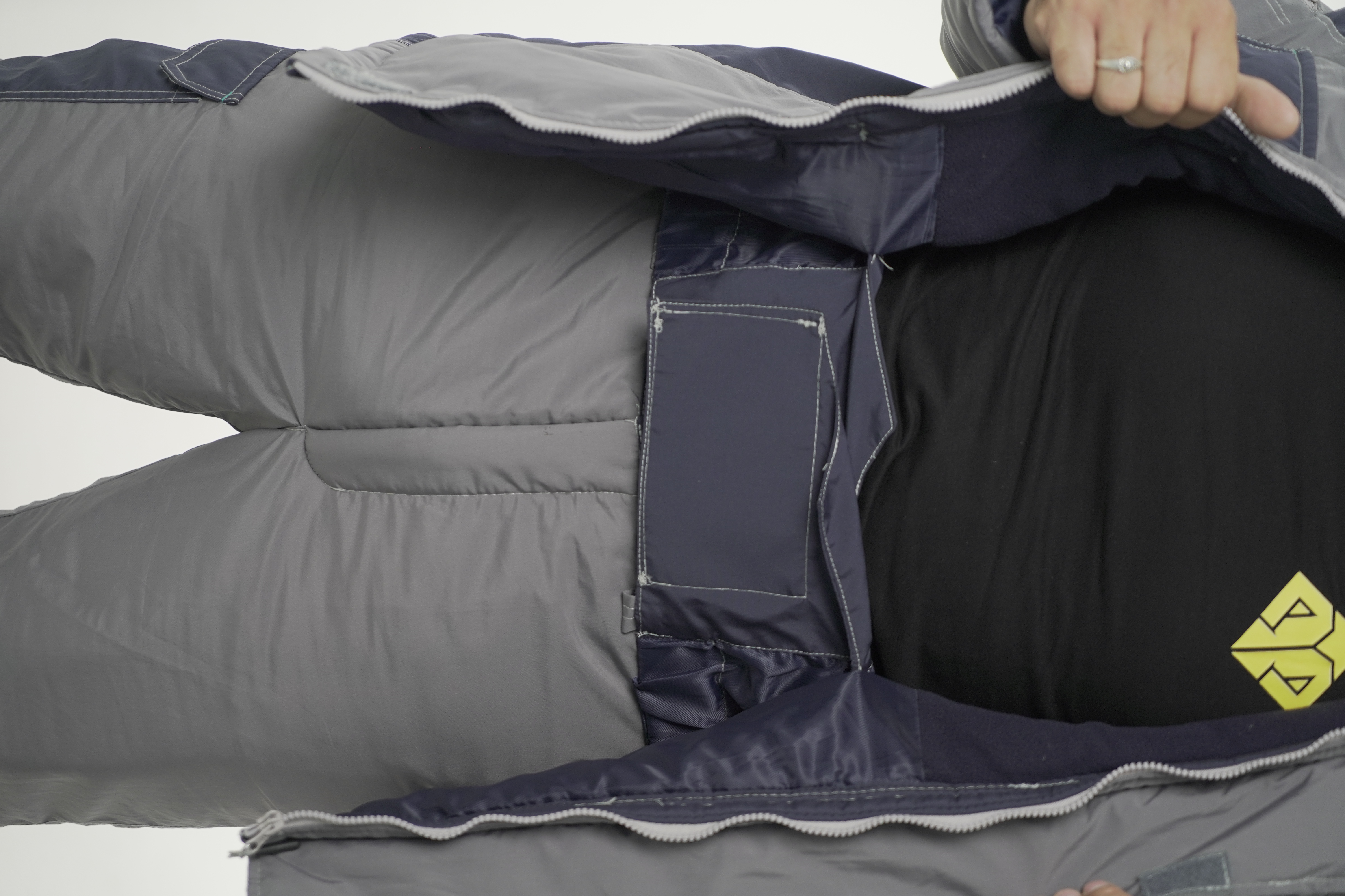 Wind-protection skirt prevents cold, wind, and snow from entering the jacket; fixed at the waist with Velcro